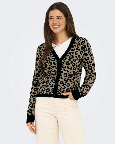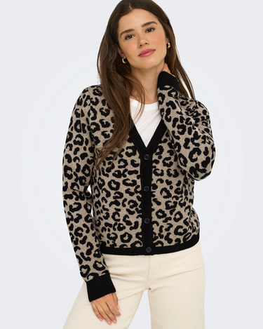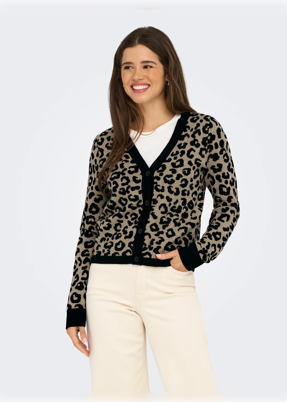 Cardigan Only maculato, realizzato in morbido e leggero tessuto con texture effetto piuma, ideale per giornate fresche. Vestibilità slim fit con maniche lunghe e scollo a V per un look femminile e moderno. Perfetto da abbinare a jeans o gonne per un outfit casual-chic dal carattere deciso.